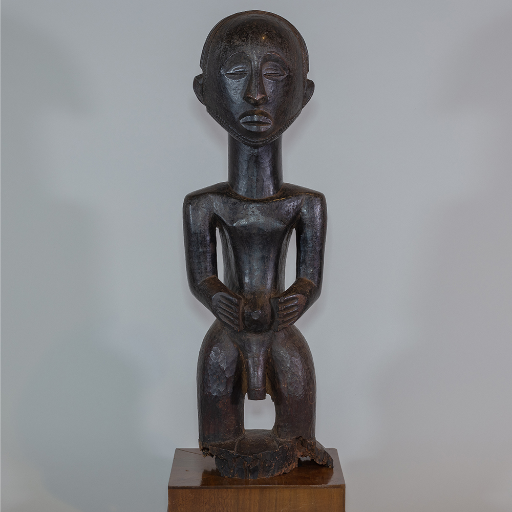 This ancestral figure evokes features associated with chiefs in Hemba society. Its design includes abstracted symbols of royal attributes: the tranquil facial expression conveys serenity, the large head indicates wisdom, and the hands placed around the protruding navel express the importance of descent traced through the mother. Ancestral figures were passed down to the Fumu Mwalo (chief of clan), who could have activated the figure during ceremonies by recalling stories of the ancestor figure’s life.