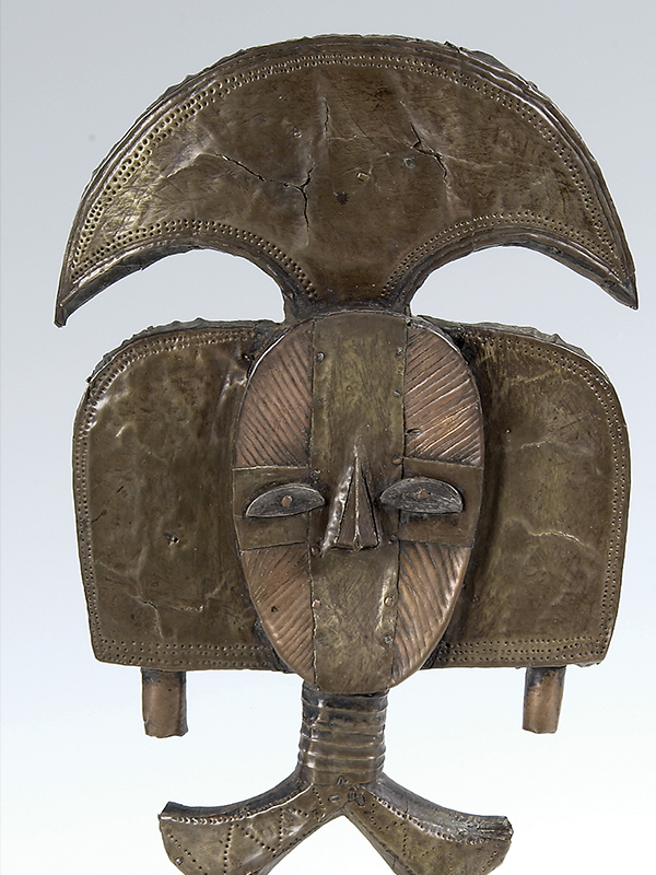 This reliquary figure represents an idealized face demonstrating the power of its owner’s ancestors. Once kept with a box containing bones of these ancestors and used for ancestral veneration, these sculptures are now used to invoke and celebrate precolonial tradition. With colonization and conversion to Christianity in the early to mid-twentieth century, many people in Kota regions sold their reliquary figures to foreign collectors, leaving fewer historical works in these regions. Such changes indicate how various people have transformed the uses of reliquary figures.
