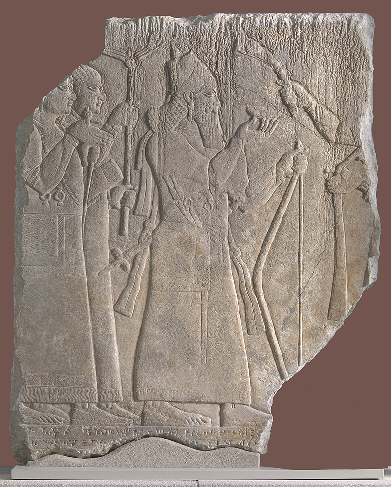 Relief panel with King Ashurnasirpal II and attendants celebrating a hunt, Mesopotamian, Neo-Assyrian, Nimrud (ancient Kalhu), Iraq, ca. 883–859 BCE, Northwest Palace, West Wing, panel 16, gypsum alabaster. Gift of Dr. Henri Byron Haskell, Medical School Class of 1855. Bowdoin College Museum of Art. 1860.5