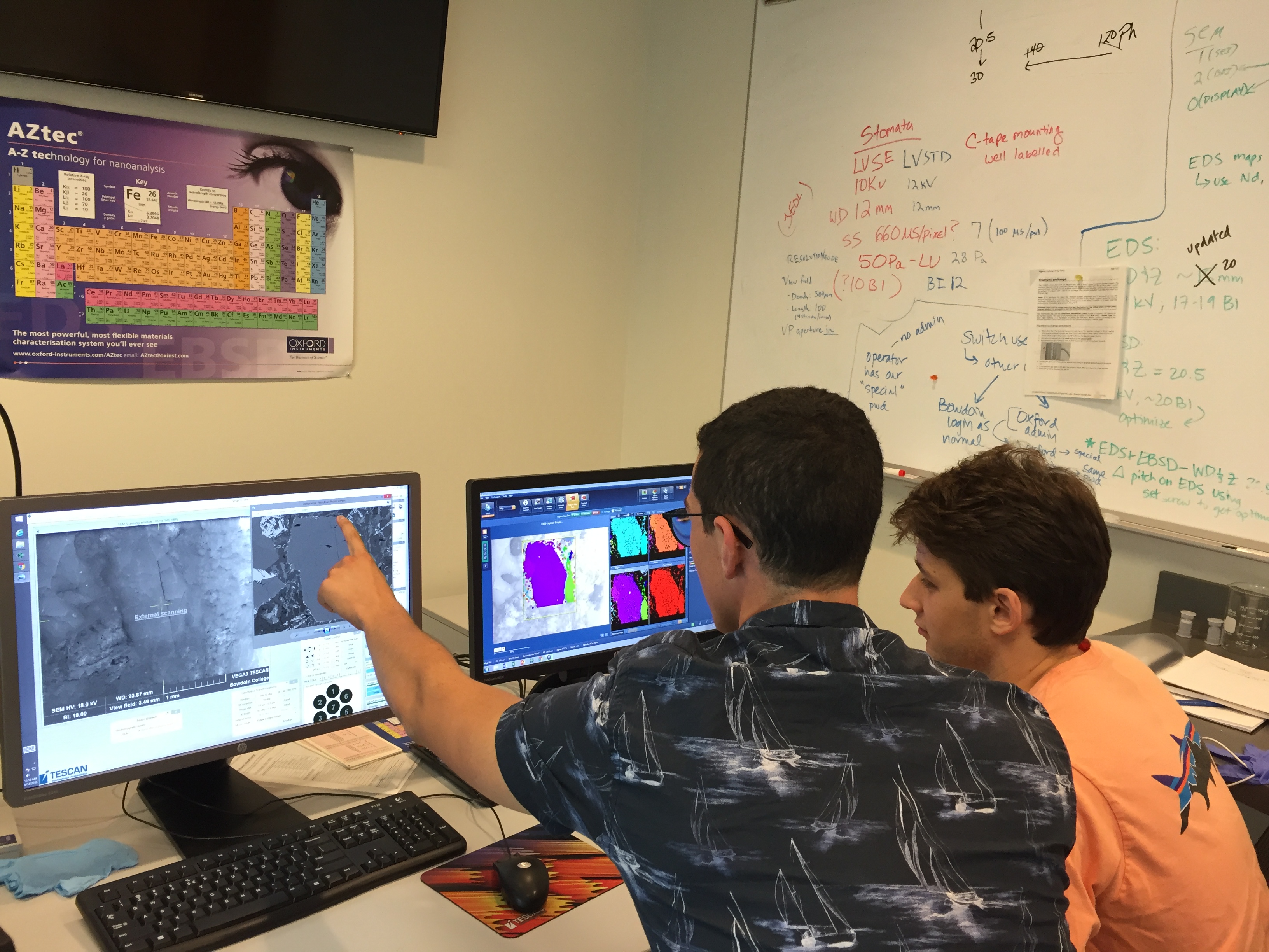 The Tescan Vega3 LMU Scanning Electron Microscope (SEM) is equipped with an array of detectors. The backscattered electron (BSE) and cathodoluminescence (CL) detectors image samples, and the energy dispersive spectrometer (EDS) and electron backscatter diffraction (EBSD) systems collect quantitative data on chemical compositions and crystal orientations. The SEM is located in the Roux Center for the Environment.