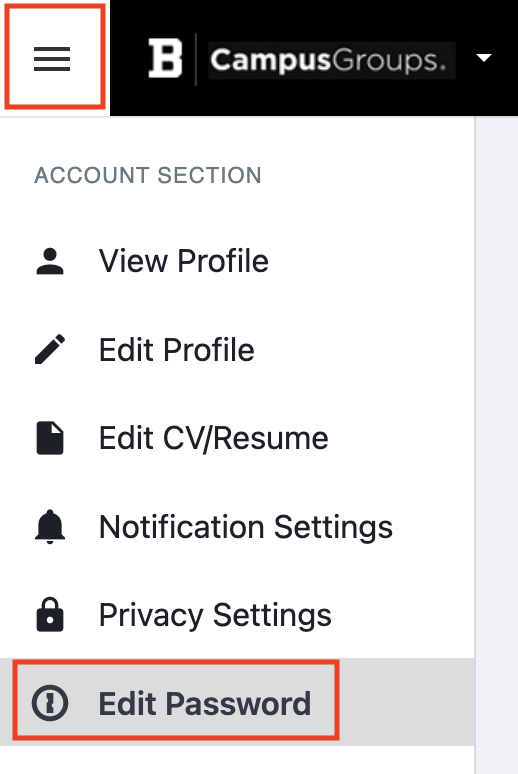 5. Your account has been created! Now you need to set a password. To do that, click on the hamburger menu icon (three stacked horizontal lines in the top-left corner); select "Edit Password." Type in a password for this CampusGroups account. Select "Save."
