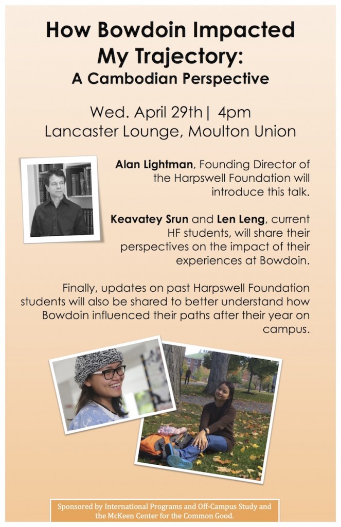After spending the year at Bowdoin through the Harpswell Foundation, two Cambodian students, Keavatey Srun and Len Leng, recently to give a talk at Bowdoin about growing up in rural Cambodia and defying expectations that they marry young and don’t go to university.