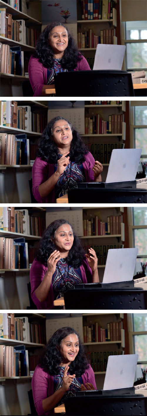 Typically during August, Associate Professor of Asian Studies Vyjayanthi Selinger works on her research. This summer, though, she put away her books on July 31 to dedicate the remaining summer to learning new technologies for her fall classes. With help from her teaching assistant, Ella Jaman ’22, she created many hours of engaging interactive content for her students— including video lessons and quizzes—by using HP5 software and one of Bowdoin’s newly issued iPads. (In support of online learning and to foster accessibility and equity, the College distributed an Apple iPad Pro with available Wi-Fi and cellular data connectivity—activated and covered by the College for those students who have internet needs—an Apple Pencil 2, and an Apple Magic Keyboard for iPad.)