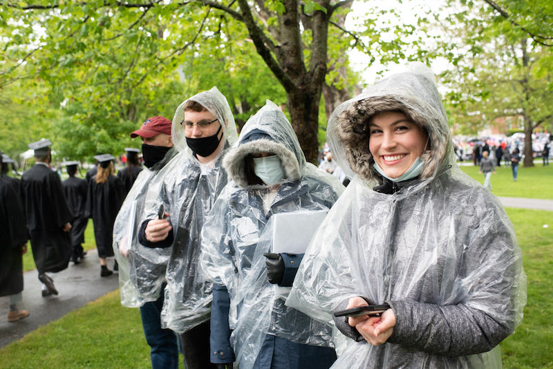 Having followed a rigorous COVID-19 testing protocol all semester long and in the days leading up to the ceremony, graduating seniors fist-bumped President Clayton Rose before making their way back to the quad where family members, classmates, and friends watched and cheered in support.