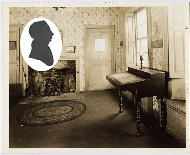 Henry Wadsworth Longfellow, Class of 1825 silhouette portrait imposed on 1950-era photograph of the “Rainy Day Room” in the poet’s childhood home in Portland, Maine, from the Collections of the Maine Historical Society.